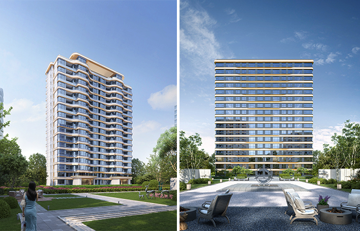 建筑立面上为体现立面的丰富性,分区设计。立面呼应潺潺流水意向,采用弧形优雅曲线,追求建筑柔美灵动之感。综合社区服务中心则在未来感与现代感的基础上,注重增加动感和活力,彰显时尚城市品位。